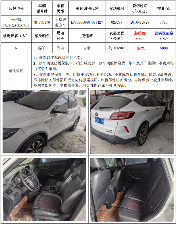 拍品编号2:一汽牌CA6462ATE5TKG1小型普通客车1辆(车辆原号牌:贵EFD175)