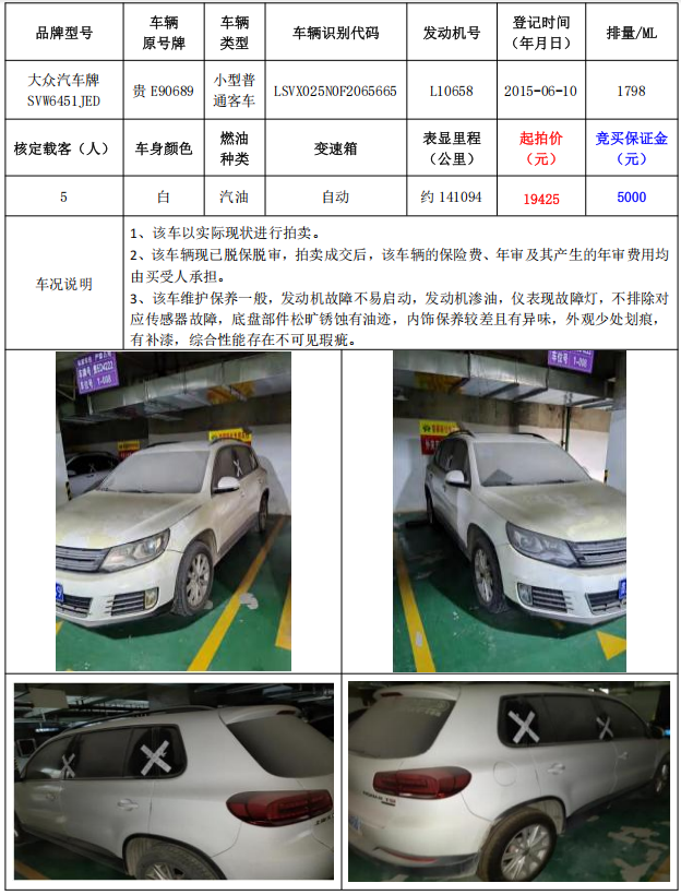 拍品编号7:大众汽车牌SVW6451JED小型普通客车1辆(车辆原号牌:贵E90689)
