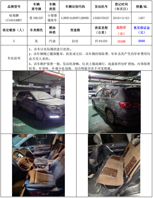 拍品编号6:哈弗牌CC6461RM07小型普通客车1辆(车辆原号牌:贵EM1507)