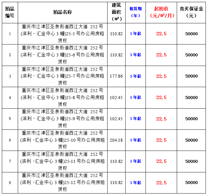 1、重庆市江津区圣泉街道西江大道 252号(滨利·汇金中心3幢) 25 层办公用房8间租赁权,建筑面积:102.45㎡-204.18㎡,租赁权起拍价:22.5元/㎡/月/间,竞买保证金:5万元/间。