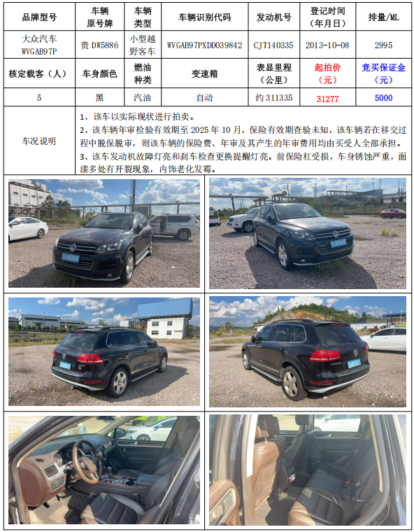 1、大众汽车WVGAB97P小型越野客车1辆,起拍价:31277元,竞买保证金:5000元。