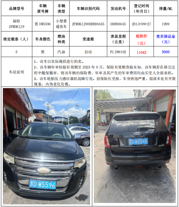 拍品编号2:福特2FMDK3J9小型普通客车1辆(车辆原号牌:贵DW5596)