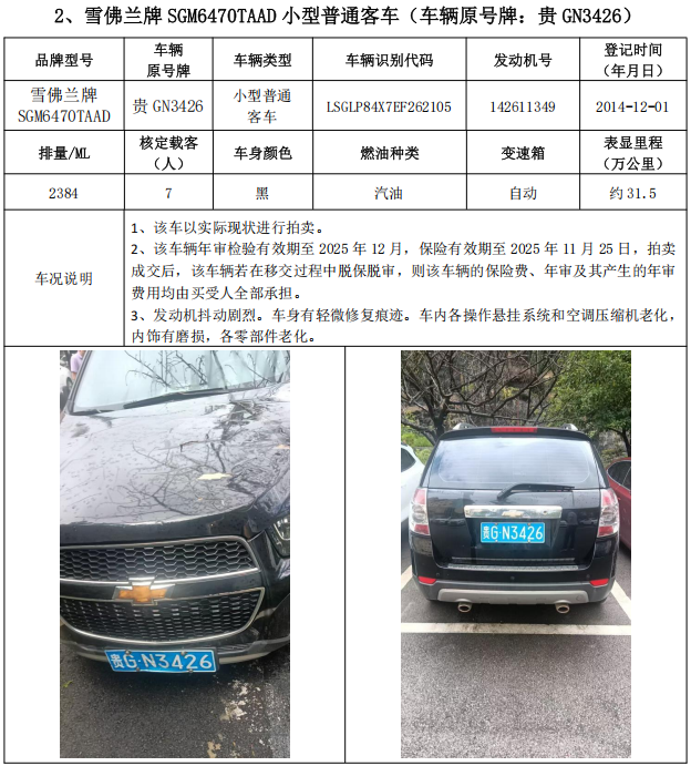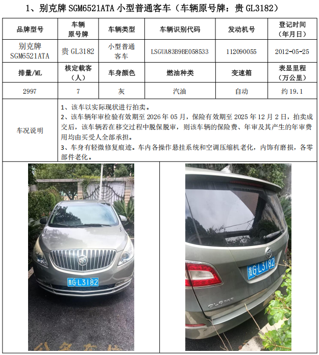 3、别克牌SGM6521ATA小型普通客车1辆、雪佛兰牌SGM6470TAAD小型普通客车2辆,共计3辆,整体拍卖,起拍价:28600元,竞买保证金:5000元。