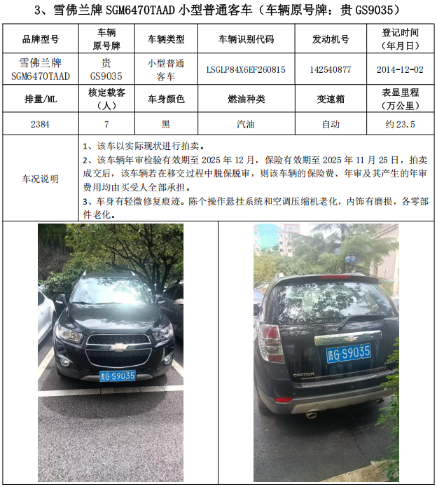 拍品编号3:别克牌SGM6521ATA小型普通客车1辆、雪佛兰牌SGM6470TAAD小型普通客车2辆,共计3辆,整体拍卖