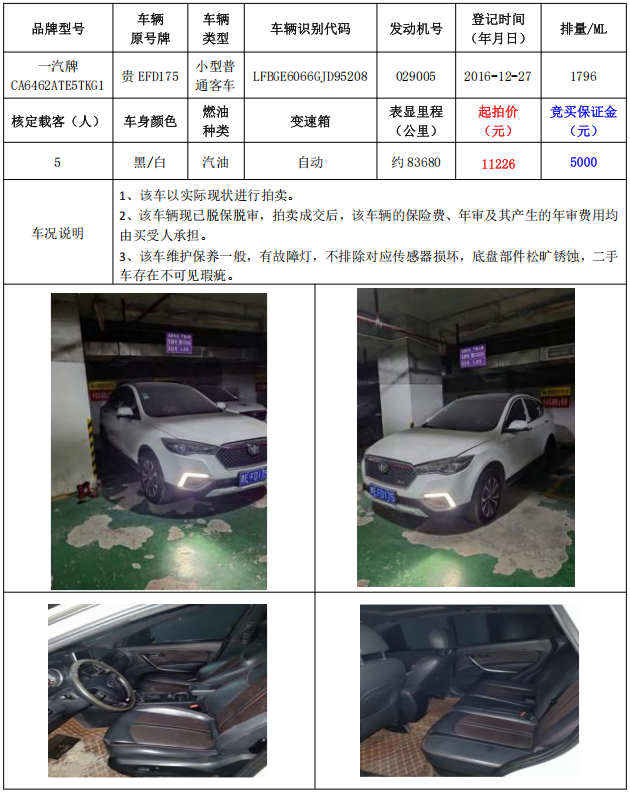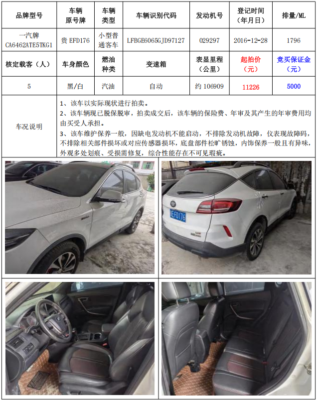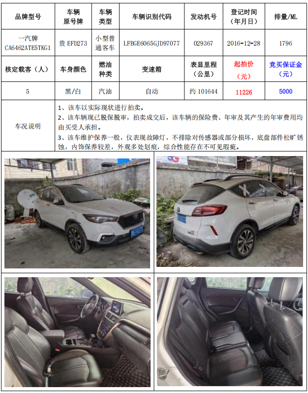 拍品编号3:一汽牌CA6462ATE5TKG1小型普通客车1辆(车辆原号牌:贵EFD273)