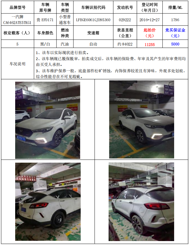 拍品编号1:一汽牌CA6462ATE5TKG1小型普通客车1辆(车辆原号牌:贵EFD271)
