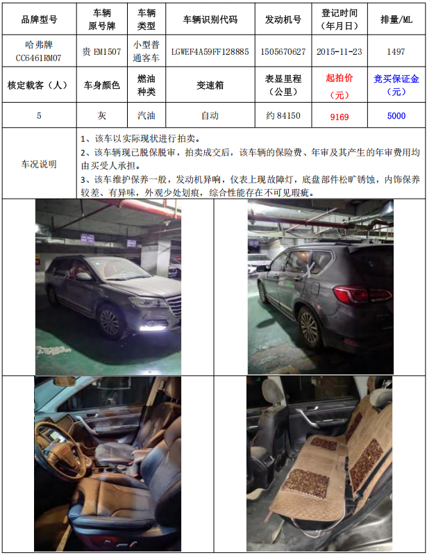 拍品编号6:哈弗牌CC6461RM07小型普通客车1辆(车辆原号牌:贵EM1507)