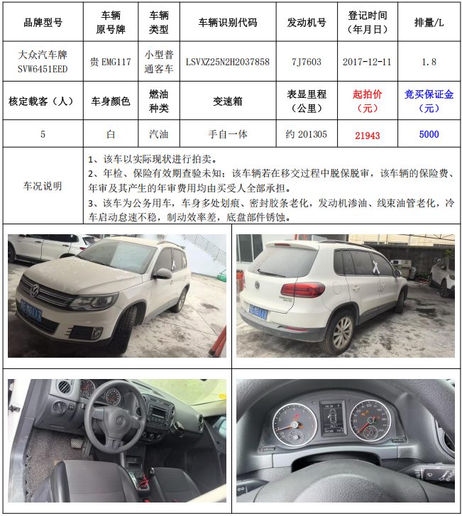 拍品编号8:大众汽车牌SVW6451EED小型普通客车一辆(车辆原号牌:贵EMG117)