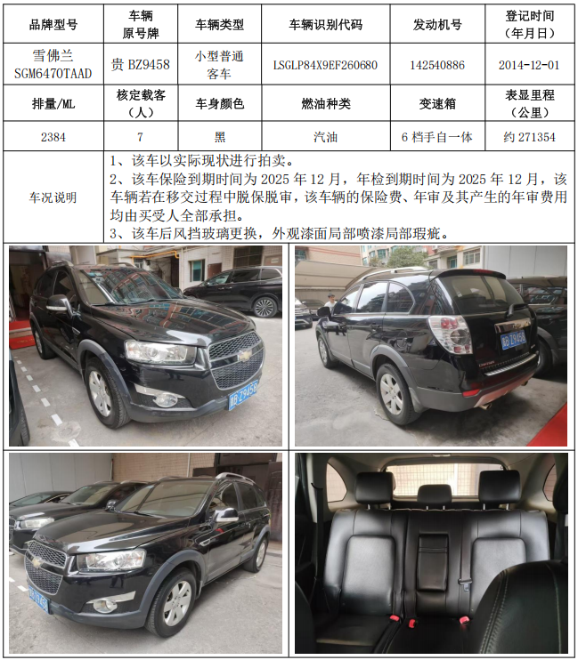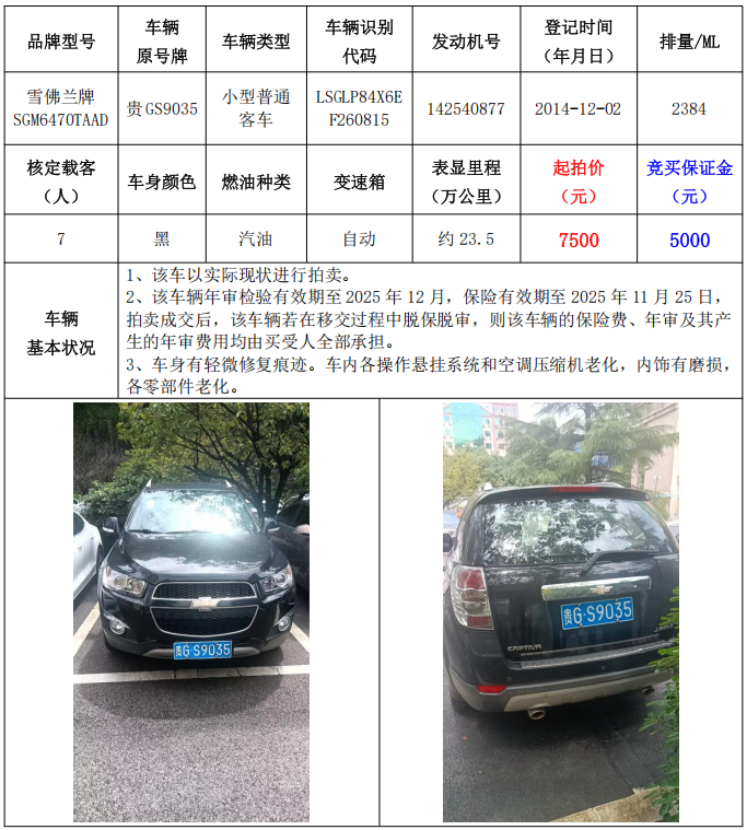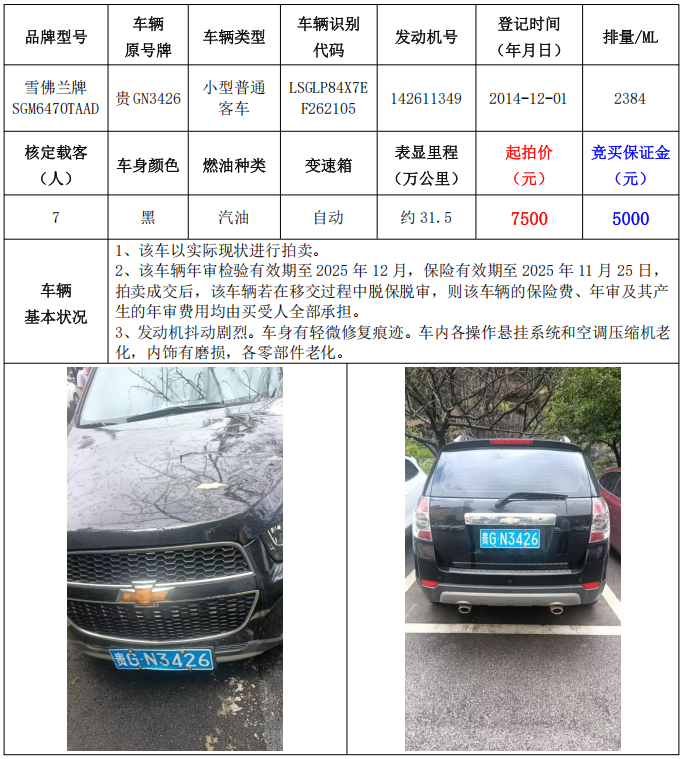 2、雪佛兰牌SGM6470TAAD小型普通客车1辆,起拍价:7500元,竞买保证金:5000元。