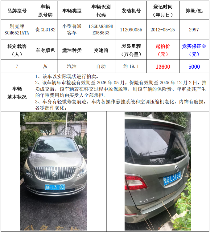 拍品编号3:别克牌SGM6521ATA小型普通客车(车辆原号牌:贵GL3182)