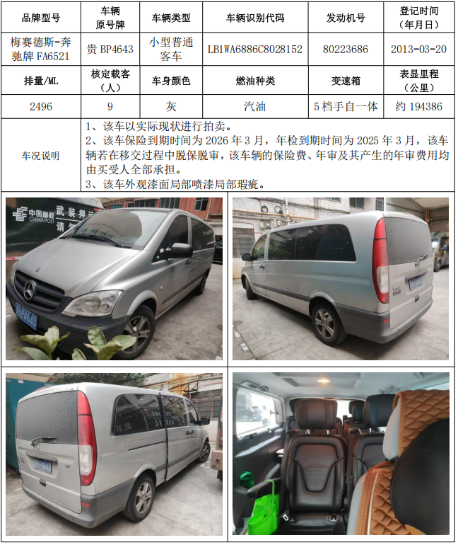 4、雪佛兰牌SGM6470TAAD小型普通客车1辆、梅赛德斯-奔驰牌FA6521小型普通客车1辆,共计2辆,整体拍卖,起拍价:33200元,竞买保证金:5000元。