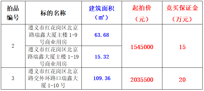 2、遵义市红花岗区北京路瑞鑫大厦主楼1-9、1-19号商业用房(整体拍卖),建筑面积:79㎡,起拍价:1545000元,竞买保证金:15万元;