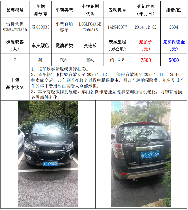 1、雪佛兰牌SGM6470TAAD小型普通客车1辆,起拍价:7500元,竞买保证金:5000元。
