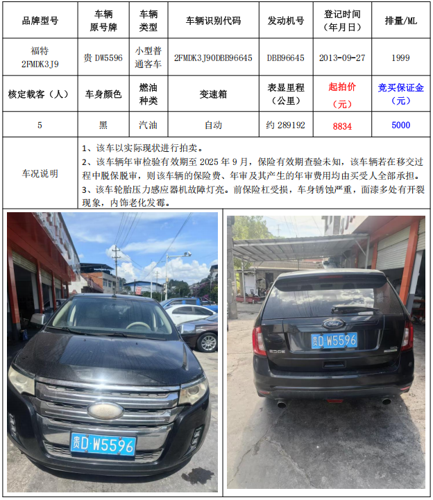 拍品编号3:福特2FMDK3J9小型普通客车1辆(车辆原号牌:贵DW5596)