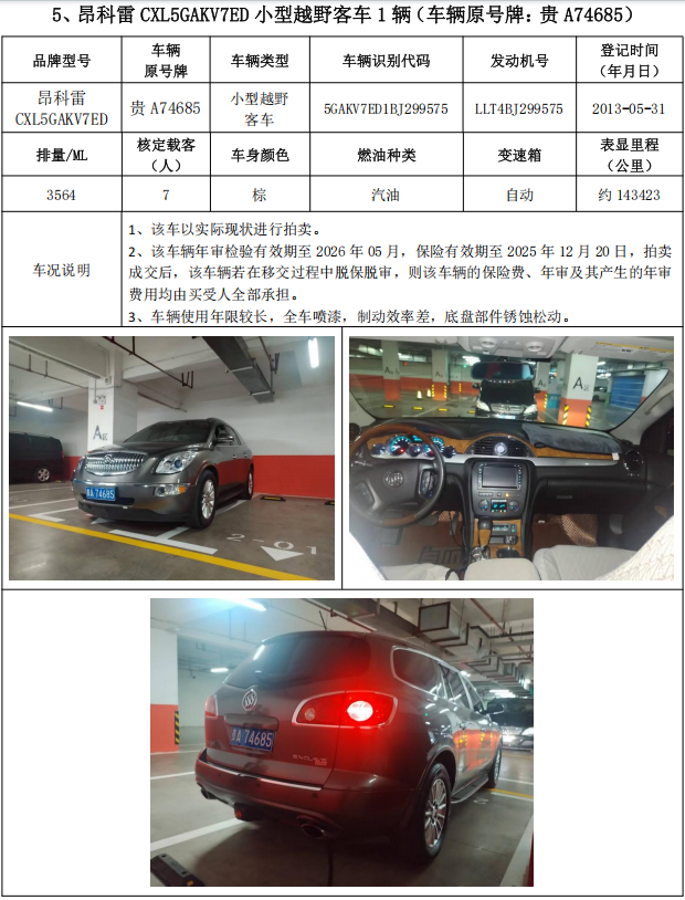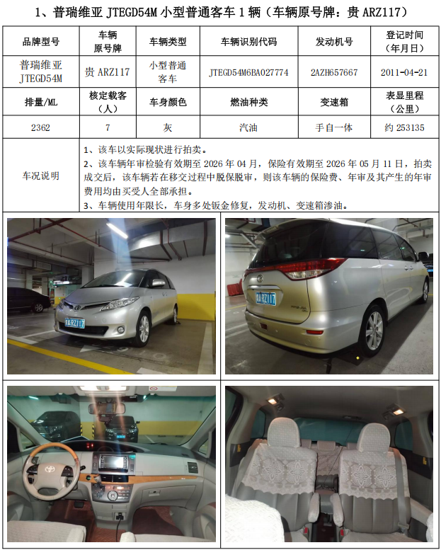 拍品编号1:普瑞维亚小型普通客车1辆、奥迪牌小型轿车2辆、昂科雷小型越野客车2辆,共计5辆,整体拍卖